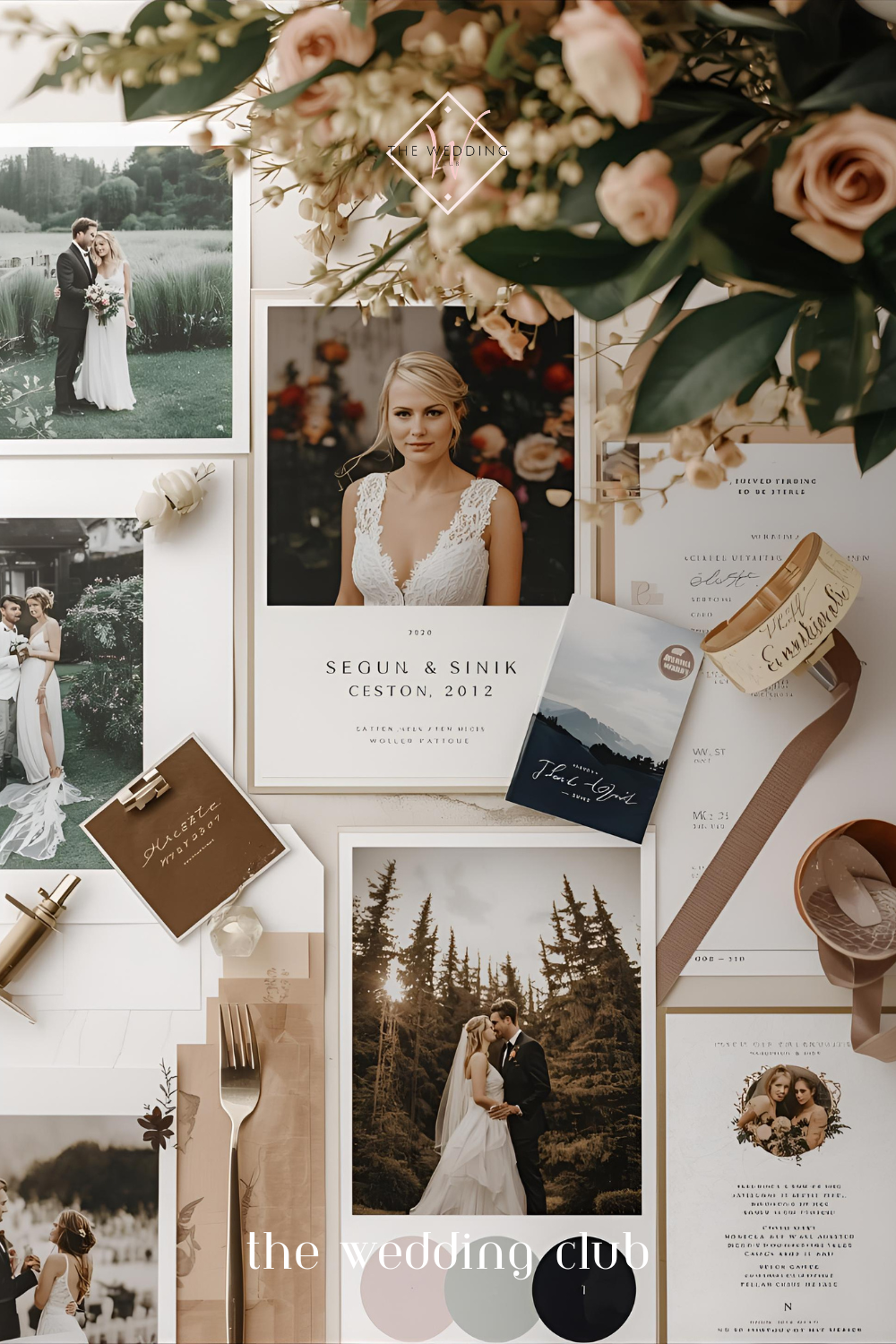 Wedding moodboard with bridal portraits, couple photos, and color swatches — curated wedding styling ideas.