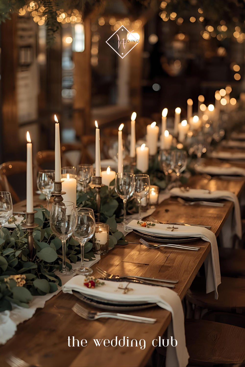 Rustic wedding reception table with candles, greenery, and wine glasses — elegant wedding décor inspiration.