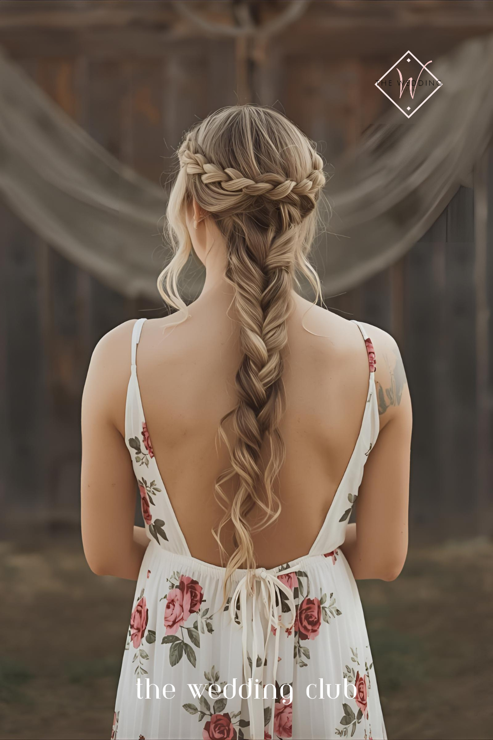 1 – Boho braided crown hairstyle, floral maxi dress, leather sandals, rustic barn wedding background