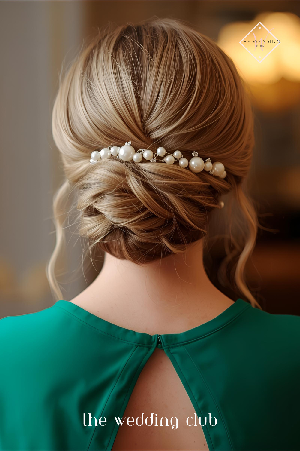 10 – Low braided bun on long hair, emerald green cocktail dress, pearl hair accessory, elegant indoor wedding