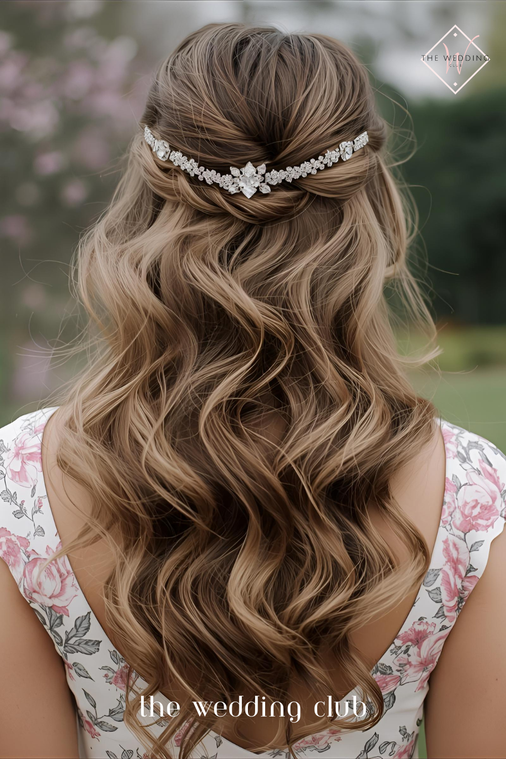 14 – Long layered waves with jeweled headband, pastel floral midi dress, spring garden wedding setting