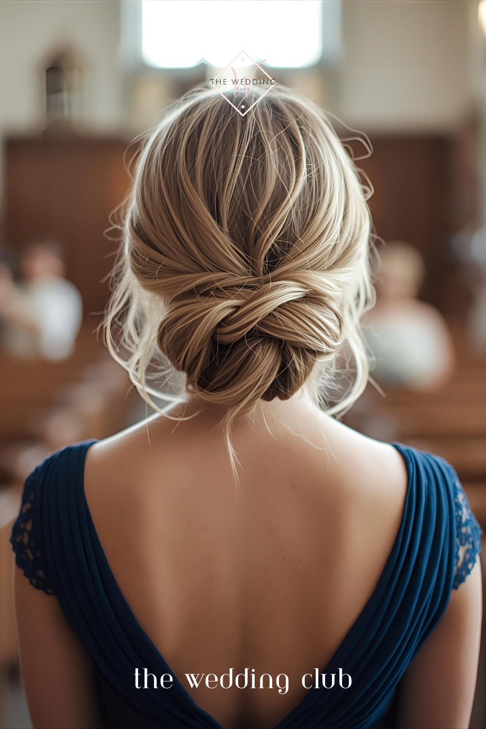 2 – Medium hair in low twisted bun, elegant blue guest dress, church wedding setting